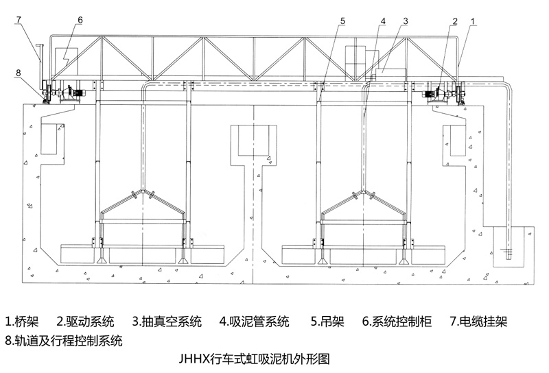行車式泵吸泥機,用于污水處理廠平流沉淀池,將沉降在池底上的污泥刮到泵吸泥口,通過泵吸,邊行車邊吸泥,然后將污泥排出池外,以便污泥回流或濃縮脫水